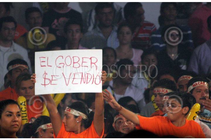 VILLAHERMOSA, TABASCO, 28ABRIL2007.- Las porras de la representante del municipio de Nacajuca muestran una cartulina con la leyenda “El gober se vendió”. FOTO: MARCO POLO GUZMÁN HERNÁNDEZ.