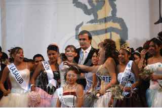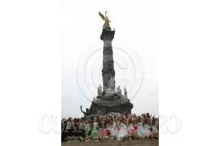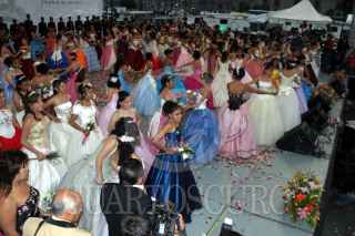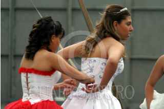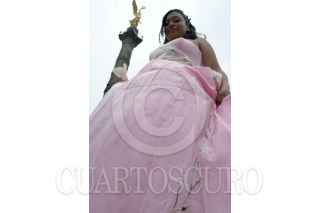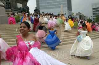 MÉXICO D.F. 28ABRIL2007.-200 quinceañeras se reunieron en el Ángel de la Independencia para realizar a foto oficial y posteriormente festajarian su cumpleños 15 en la explanada de la Plaza de la Constitución, en la imagen una de las quinceañeras le acomoda el vestido a una de sus compañeras. FOTO: SAÚL LÓPEZ/CUARTOSCURO.COM