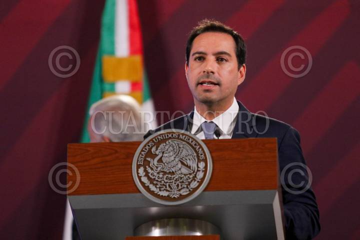 CIUDAD DE MÉXICO, 24JULIO2023.- Andrés Manuel López Obrador, Presidente de México, habló sobre el Tren Maya y Pemex durante la mañanera. Lo acompañaron Mauricio Vila Dosal, gobernador de Yucatán; Javier May Rodríguez, director general de Fondo Nacional de Fomento al Turismo (Fonatur); Diego Prieto Hernández, director general del Instituto Nacional de Antropología e Historia (INAH); Ricardo Sheffield Padilla, titular de la Procurador Federal del Consumidor(Profeco); Guadalupe Phillips Margain, directora general de ICA; Blas Andrés Núñez Jordán, jefe del Centro Coordinador de Operaciones del Tren Maya. FOTO: MOISÉS PABLO/CUARTOSCURO.COM