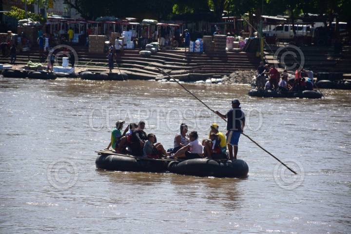 SUCHIATE, CHIAPAS, 25JULIO2023.- Migrantes siguen cruzando por el rio Suchiate de Guatemala a México. Los balseros calculan que ingresan a diario unos 100 a 200 migrantes de diferentes nacionalidades. Muchos de ellos se quedan en campamento por varios días al margen del afluente. FOTO: DAMIÁN SÁNCHEZ/CUARTOSCURO.COM