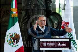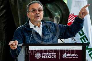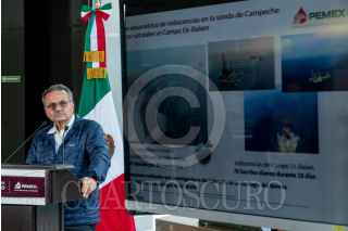 CIUDAD DE MÉXICO, 26JULIO2023.- Octavio Romero Oropeza, director general de Petróleos Mexicanos, encabezó la conferencia de prensa en las oficinas centrales de la dependencia, donde dio detalles sobre el supuesto derrame de crudo en Campeche a inicios de este mes. Romero Oropeza explicó que se trato de una pequeña fuga en uno de los ductos que fue reportado al día siguiente y que no provocó mayores daños, enfatizó que las imágenes difundidas y la supuesta extensión fueron mal calculados por lo medios y que las manchas corresponden a “Chapopoteras” de la sonda en Cantarell. Lo anterior es un fenómeno natural de hace millones de años. FOTO: GALO CAÑAS/CUARTOSCURO.COM