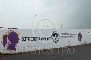 CIUDAD DE MÉXICO, 27JULIO2023.- Diversas vallas publicitarias con la silueta de la aspirante Claudia Sheinbaum y el hashtag “Grupo Central es Claudia” se observan a lo largo de la Central de Abastos (CEDA) en la alcaldía Cuauhtémoc. FOTO: GALO CAÑAS/CUARTOSCURO.COM