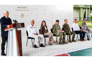 TEPIC, NAYARIT. 28JULIO2023.- Andrés Manuel López Obrador, presidente Constitucional de los Estados Unidos Mexicanos en conferencia de prensa matutina desde Nayarit. Lo acompañan Miguel Ángel Navarro Quintero, gobernador Constitucional del Estado de Nayarit; Luisa María Alcalde Luján, secretaria de Gobernación; Luis Cresencio Sandoval González, secretario de la Defensa Nacional; José Rafael Ojeda Durán, secretario de Marina; Luis Rodríguez Bucio, subsecretario de Seguridad Pública de la Secretaría de Seguridad y Protección Ciudadana (SSPC) y David Córdova Campos, comandante de la Guardia Nacional. FOTO: PRESIDENCIA/CUARTOSCURO.COM