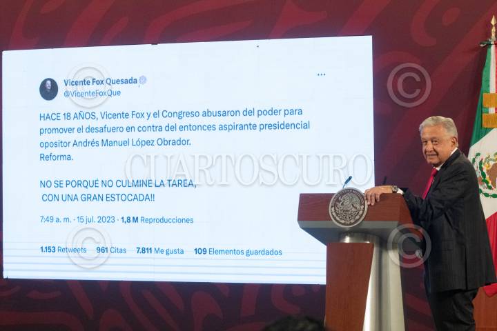 CIUDAD DE MÉXICO, 31JULIO2023.- Andrés Manuel López Obrador, Presidente de México, encabezó la mañanera en Palacio Nacional, en donde se dieron detalles del Tren Maya y las obras que está realizando la CFE y la Sedena para electrificar está sistema. FOTO: MOISÉS PABLO/CUARTOSCURO.COM