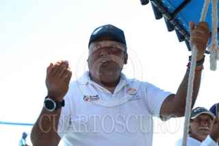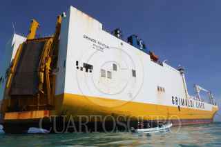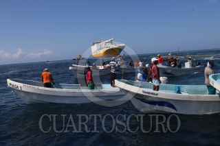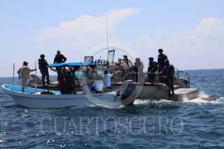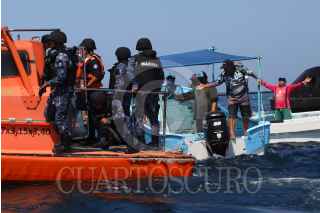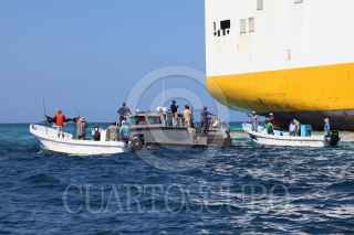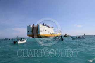 SISAL, YUCATÁN, 01AGOSTO2023.- El pasado 25 de julio un enorme buque ferry repleto de contenedores y vehículos denominado Grande Senegal "encalló" frente a la costa de Sisal en la zona de coral conocida cómo bajo de Madagascar. Hoy por la mañana pescadores de este puerto se manifestaron en contra de las maniobras de arrastre que realizan para retirarlo de dicho lugar, los hombres de mar argumentan que el daño ocasionado por este buque es incontable puesto que afectó una zona de reproducción de especies de escamas, crustáceos, moluscos, tortugas, entre otros. Por un momento el ambiente se puso tenso al intervenir la Marina Armada de México pidiéndole a los manifestantes alejarse de esa zona por lo que fueron abordados verbalmente por los pescadores quienes temen que dichas maniobras de remolque ocasionen un daño mayor en el arrecife. Al lugar arribó Cristóbal Cáceres González Baca, director regional Península de Yucatán y Caribe Mexicano CONANP, quien calmó los ánimos y comentó que el barco ya se encuentra asegurado por la Marina a través del Navío “Tabasco” y que será trasladado al Puerto de Progreso para responder por las denuncias medioambientales en su contra. FOTO. MARTIN ZETINA/CUARTOSCURO.COM