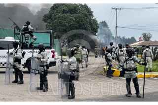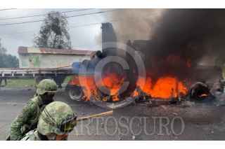 HUITZILAC, MORELOS, 02AGOSTO2023.- Un operativo contra talamontes llevado a cabo por investigadores de la Fiscalía de Morelos, apoyados por soldados del Ejército y elementos de la Guardia Nacional devino en un enfrentamiento contra un grupo de 120 personas, que quemaron 3 vehículos de carga y un tractocamión en la colonia Alcanfores de esta municipalidad, no se reportan detenidos. El grupo de personas se oponían al cateo y aseguramiento de dos sitios donde se almacenaba madera cortada de manera ilegal en el Bosque de Agua. FOTO: ESPECIAL / CUARTOSCURO.COM