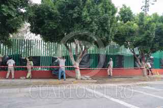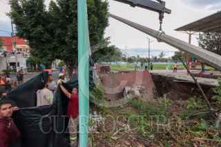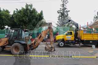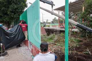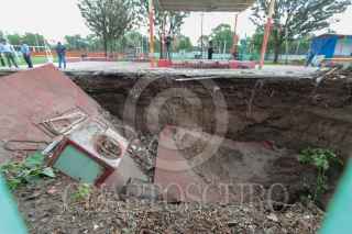 CIUDAD DE MÉXICO, 03AGOSTO2023.- Un gimnasio de box fue tragado por un socavón que se registró en el Deportivo Gertrudis Sánchez, ubicado en la calle Oriente 119 y Norte 29, en la alcaldía Gustavo A. Madero. No hubo lesionados. Personal del gobierno capitalino taparon las rejas para que no se pudiera observar el incidente. FOTO: ROGELIO MORALES/CUARTOSCURO.COM