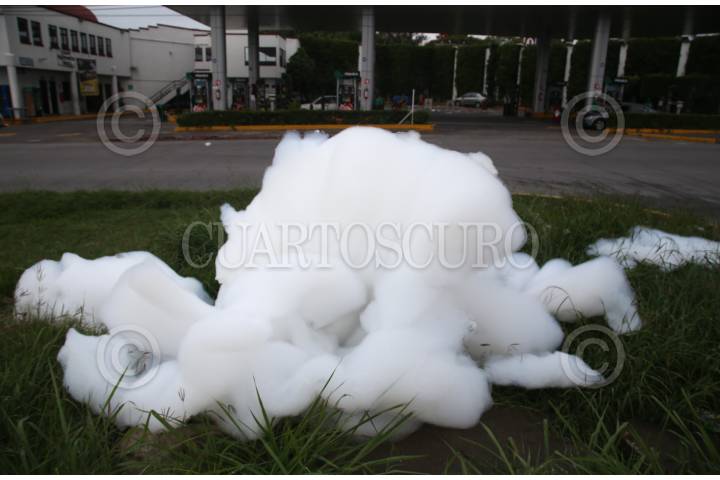 JIUTEPEC, MORELOS, 06AGOSTO2023.- Durante la mañana de este domingo se pudo observar en el camellón del boulevard Cuauhnáhuac, a la altura del poblado de Tejalpa, bolas de espuma que salían del sistema de drenaje a través de los orificios de alcantarillas. El peculiar suceso llamo la atención de transeúntes y automovilistas que trataban de evadir el contacto con la sustancia espesa. Este sistema de drenaje recibe las aguas residuales de las fábricas de la Ciudad Industrial del Valle de Cuernavaca. FOTO: MARGARITO PÉREZ RETANA / CUARTOSCURO.COM