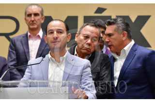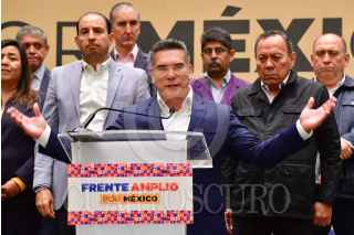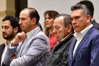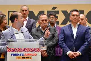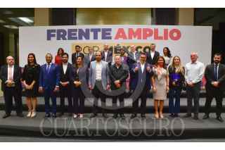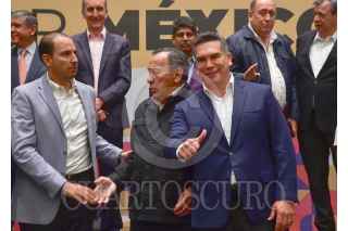 CIUDAD DE MÉXICO, 08AGOSTO2023.- Los dirigentes nacionales Marko Cortés (PAN), Alejandro Moreno (PRI) y Jesús Zambrano, (PRD), junto a integrantes de las secretarías generales, coordinadores parlamentarios y del comité organizador del Frente Amplio por México, encabezaron la presentación de los observadores que conformarán la "Misión de Acompañamiento Cívico" en el procedimiento interno de la elección del coordinador general de la coalición. FOTO: MARIO JASSO/CUARTOSCURO.COM