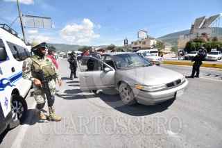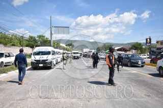 CHILPANCINGO, GUERRERO, 08AGOSTO2023.- Luego de los hechos violentos suscitados en la capital del estado y que cobrara la vida de 3 choferes de transporte público, agentes del Ejercito Mexicano, Guardia Nacional, Policía y Transito estatal, desplegaron un operativo de seguridad y revisión en el bulevar Chilpancingo-Petaquillas. Luego de 24 horas de los hechos ocurridos en la capital del estado, en el punto conocido como el ‘Retorno de La Cinca’, las fuerzas castrenses instalaron su reten. Se trata de un desplegado de agentes del ámbito federal y estatal, además de vehículos y un camión blindado antidisturbios. FOTO: DASSAEV TÉLLEZ ADAME/CUARTOSCURO.COM