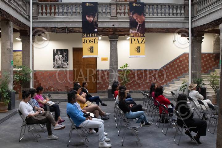 CIUDAD DE MÉXICO, 14AGOSTO2023.- Manuel Morales Iniesta, Rafael Vargas, Anthony Stanton, y Leticia Luna, participaron en un conversatorio "La presencia de Marie José Tramini en la Poesía de Octavio Paz", en el marco del 89 aniversario del natalicio de quien también era conocida Marie-Jo Paz, esto fue en la casa que compartieran ambos en vida, en la colonia Tacuba. FOTO: MOISÉS PABLO/CUARTOSCURO.COM