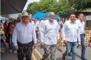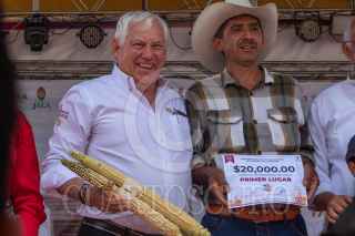 JALA, NAYARIT, 16AGOSTO2023.- El concurso del Elote más Grande del Mundo, Jala 2023, es un ejemplo de la importancia de cuidar y mantener la calidad de las razas autóctonas de los granos y salvaguardar nuestras tradiciones, orígenes y cultura nacional, afirmó el secretario de Agricultura y Desarrollo Rural, Víctor Villalobos Arámbula. El secretario Villalobos Arámbula, el gobernador Miguel Ángel Navarro Quintero y el coordinador general de Programas para el Bienestar, Carlos Torres Rosas, entregaron el primer lugar a Óscar Saúl Elías Pérez, con un elote de 49 centímetros; el segundo a José Ismael Elías Pérez, con una mazorca de 47.5 centímetros, y el tercer lugar a Isair Manuel Elías Delgado, con una pieza de 45 centímetros. FOTO: SADER/CUARTOSCURO.COM