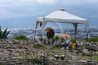 TOLUCA, ESTADO DE MÉXICO, 21AGOSTO2023.- Integrantes de la Unidad de Arqueología de Toluca continúan los trabajos en el Proyecto Cerro Dios Tolo, el que ha avanzado de manera constante en la conservación y mantenimiento de dos estructuras, una de ellas semicircular que está en la fase de consolidación, el parque ecocultural estará integrado por 11 hectáreas. Los primeros trabajos iniciaron en 1999 con pozos de sondeo en donde les permitió identificar la presencia de lo muros y terrazas del Centro del Señorio Matlazinca, este proyecto busca también la protección medio ambiental. Es un sitio arqueológico en investigación y se encuentra cerrada al público. FOTO: CRISANTA ESPINOSA AGUILAR / CUARTOSCURO.COM