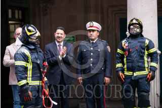 CIUDAD DE MÉXICO, 22AGOSTO2023.- Con la presencia de Juan Manuel Pérez Cova, director general del Heroico Cuerpo de Bomberos de la Ciudad de México; Martí Batres, Jefe de Gobierno; Ricardo Ruiz Suárez, secretario de Gobierno, y personal del Heroico Cuerpo de Bomberos celebraron el Día de las y los Bomberos. En ceremonia celebrada en el patio del Antiguo Palacio del Ayuntamiento las autoridades entregaron equipo nuevo para los traga humos y destacaron su labor al servicio de los capitalinos. FOTO: GOBIERNO DE LA CIUDAD DE MÉXICO/CUARTOSCURO.COM