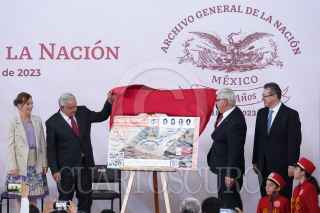 CIUDAD DE MÉXICO, 23AGOSTO2023.- Andrés Manuel López Obrador, presidente de México, acompañado de su esposa Beatriz Gutiérrez Müller; Carlos Enrique Luis Abreu, director General del Archivo de la Nación; Martí Batres, jefe de Gobierno, y Luisa María Alcalde Luján, secretaria de Gobernación, encabezaron el 200 Aniversario del Archivo General de la Nación. FOTO: GRACIELA LÓPEZ /CUARTOSCURO.COM