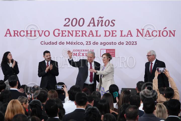 CIUDAD DE MÉXICO, 23AGOSTO2023.- Andrés Manuel López Obrador, presidente de México, acompañado de su esposa Beatriz Gutiérrez Müller; Carlos Enrique Luis Abreu, director General del Archivo de la Nación; Martí Batres, jefe de Gobierno, y Luisa María Alcalde Luján, secretaria de Gobernación, encabezaron el 200 Aniversario del Archivo General de la Nación. FOTO: GRACIELA LÓPEZ /CUARTOSCURO.COM