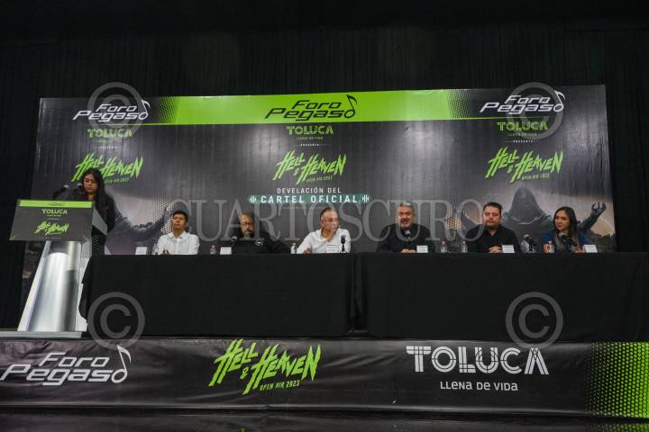 TOLUCA, ESTADO DE MÉXICO, 24AGOSTO2023.- Juan Carlos Guerrero organizador del Hell and Heaven, Luis Manuel García director general del Centro Dinámico Pegaso y Foro Pegaso, y el alcalde de Toluca Reymundo Martínez Carbajal presentaron el cartel del Hell and Heaven 2023 que tendrá como sede el Foro Pegaso, que se realizará el próximo 3, 4 y 5 de noviembre, contará con 5 escenarios, área de camping, zona de esparcimiento, comida, espectáculos y área de lucha libre, así como zona vikinga. Este año se contará con la presencia de bandas como Guns ‘N Roses, Muse, Slipknot, Helloween, Lacrimosa, y muchas bandas más. FOTO: CRISANTA ESPINOSA AGUILAR /CUARTOSCURO.COM