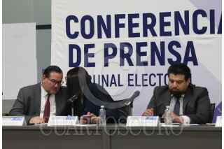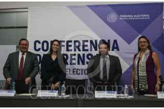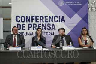 CIUDAD DE MÉXICO, 28AGOSTO2023.- Oscar Santiago Sánchez, secretario administrativo; Ana Cecilia López Dávila, subsecretaria general de acuerdos; José Luis Alcudia Goya, director general de comunicación social; y Janet de Luna Jiménez, directora general de Recursos Financieros durante conferencia de prensa del Tribunal electoral donde se dieron detalles del proyecto de presupuesto 2024, en el marco del Proceso Electoral Federal 2023-2024. FOTO: ANDREA MURCIA /CUARTOSCURO.COM