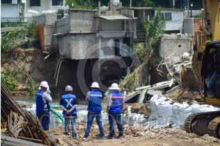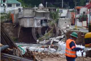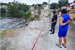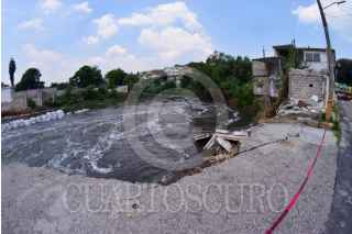 TULA DE ALLENDE, HIDALGO. 01SEPTIEMBRE2023.- Un incremento en el nivel del río Tula, que recibe las aguas residuales del Valle de México y su zona metropolitana, causó este viernes el colapso de una vivienda en la calle Poniente 14, en la Unidad Habitacional Pemex (UHP), de Tula de Allende. La vivienda ya se encontraba deshabitada pues hace semanas otro incremento del nivel ocasionó un primer desgajamiento. Vecinos de la zona acusaron que Conagua no les ha informado qué acciones procederán ante los deslaves. FOTO: FRANCISCO VILLEDA/CUARTOSCURO.COM