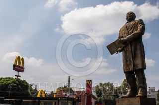 CIUDAD DE MÉXICO, 03SEPTIEMBRE2023.- Estatua de Benito Juárez, en la alcaldía del mismo nombre, al fondo una franquicia de McDonald's. FOTO: MOISÉS PABLO/CUARTOSCURO.COM