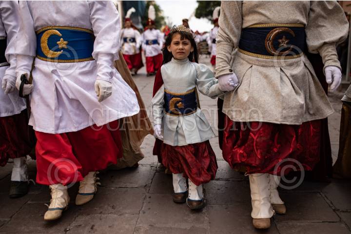 ZACATECAS, ZACATECAS, 03SEPTIEMBRE2023.- Como cada año, se llevo a cabo el tradicional desfile Morismas de Bracho, por las principales calles del centro histórico. Desde el jueves 31 de agosto hasta este domingo, mas de 19 mil zacatecanos, entre adultos mayores, jóvenes, mujeres, niños y bebés, participan en las representaciones teatrales de las batallas entre cristianos y musulmanes en honor al patrono católico San Juan Bautista, tradición que data desde 1830. FOTO: ADOLFO VLADIMIR /CUARTOSCURO.COM