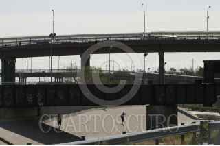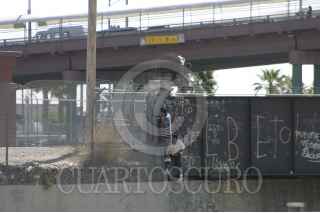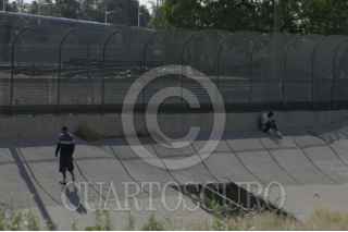 CIUDAD JUARE,Z CHIHUAHUA. 09 DE MAYO DEL 2007.- A la orilla de la malla fronteriza que delimita los territorios de mexico y los EUA, se observa a un grupo de inmigrantes quienes caminan sobre el cauce del rio bravo buscando un hueco entre la malla por el cual introducirse de manera ilegal hacia Estados Unidos, buscndo trabajos mejor remunerados. La imagen fue tomada en las inmediaciones del puente internacional Paso del Norte-Santa Fe, que comunica a esta ciudad con el condado de El Paso Texas, EU. FOTO: JOAQUÍN MURRIETA/CUARTOSCURO.COM