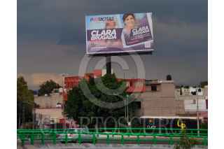 Un espectacular promueve la biografía de la alcaldesa de Iztapalapa, Clara Brugada, enfrente de uno de los puentes de Periférico Oriente