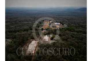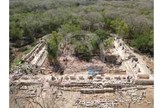 KABAH, YUCATÁN, 07SEPTIEMBRE2023.- Derivado de los trabajos de mejora de infraestructura que se realizan en la Zona Arqueológica de Kabah, en Yucatán, en el marco del proyecto prioritario del Tren Maya, personal del Instituto Nacional de Antropología e Historia (INAH) descubrió dos conjuntos de edificaciones de uso habitacional. En la imagen aérea, la zona cuyo nombre en maya significa “Señor de la mano fuerte o poderosa”, se ubica aproximadamente a 100 kilómetros de la ciudad de Mérida, y se fundó entre los años 250 y 500 de nuestra era, por migrantes de la región del Petén guatemalteco o beliceño. FOTO: INAH/CUARTOSCURO.COM