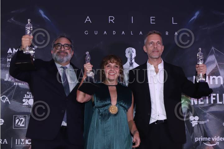 GUADALAJARA, JALISCO, 09SEPTIEMBRE2023.- Eugenio Caballero, Daniela Rojas y Carlos Y. Jacques se llevaron la estatuilla a Mejor Diseño de Arte por la película Bardo, falsa crónica de unas cuantas verdades, en la 65ª Edición del Premio Ariel que entrega la Academia Mexicana de las Artes y las Ciencias Cinematográficas a lo mejor del cine nacional, en el Teatro Degollado. FOTO: EDGAR NEGRETE LIRA/CUARTOSCURO.COM