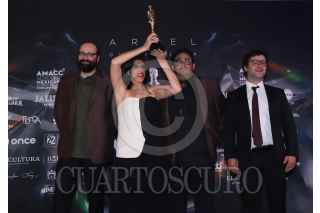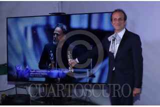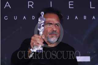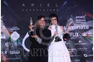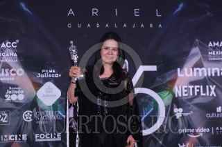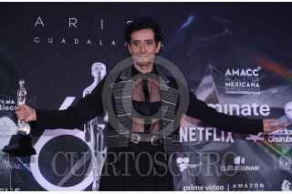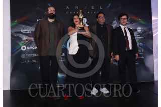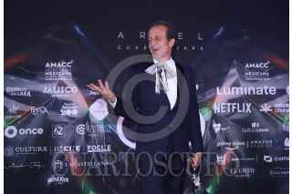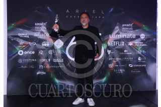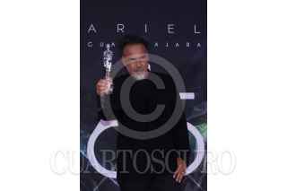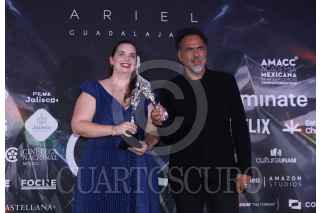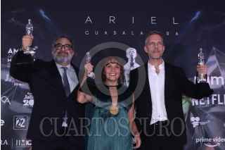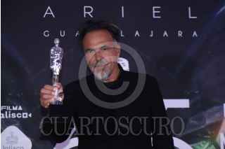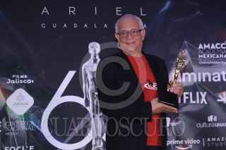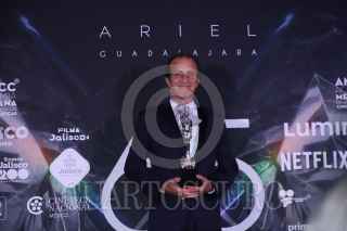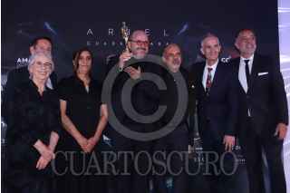 GUADALAJARA, JALISCO, 09SEPTIEMBRE2023.- El rector Ricardo Villanueva Lomelí junto al Departamento de Imagen y Sonido (DIS) de la Universidad de Guadalajara se llevó la estatuilla Ariel de Oro en la 65ª Edición del Premio Ariel que entrega la Academia Mexicana de las Artes y las Ciencias Cinematográficas a lo mejor del cine nacional, en el Teatro Degollado. FOTO: EDGAR NEGRETE LIRA/CUARTOSCURO.COM