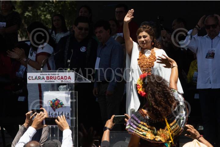 CIUDAD DE MÉXICO, 10SEPTIEMBRE2023.- Clara Brugada, alcaldesa de Iztapalapa, presentó su 5 Informe de Gobierno en el cual destacó sus logros al frente de esta demarcación como las Utopías, además ahí mismo informó que renunciará a partir del 16 de septiembre e irá a buscar la candidatura de Morena para la Jefatura de Gobierno. La acompañaron Alejandra Frausto, José Carlos Acosta, Jesús Ramírez Cuevas, Ricardo Ruiz, Daniela Cordero Arenas, y Judith Vanegas Tapia. Brugada se reunió ante miles de iztapalapenses en el Deportivo de Santa Cruz Meyehualco. FOTO: MOISÉS PABLO/CUARTOSCURO.COM