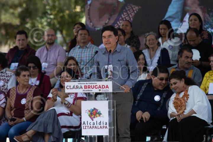 CIUDAD DE MÉXICO, 10SEPTIEMBRE2023.- Jesús Ramírez Cuevas, Vocero de la Presidencia, ofreció un mensaje durante el 5 Informe de Gobierno de Clara Brugada, en el Deportivo de Santa Cruz Meyehualco. FOTO: MOISÉS PABLO/CUARTOSCURO.COM