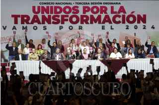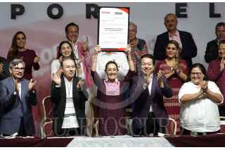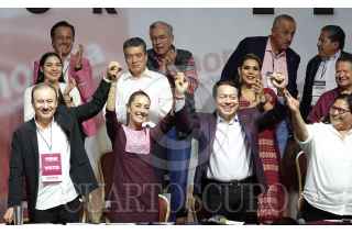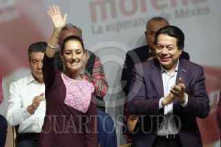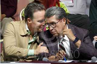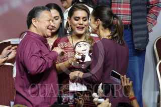 CIUDAD DE MÉXICO, 10SEPTIEMBRE2023.- Julio Menchaca, gobernador de Hidalgo, y Evelyn Salgado, gobernadora de Guerrero, entregaron un peluche a Claudia Sheinbaum, coordinadora de los Comités en Defensa de la Cuarta Transformación durante la Tercera Sesión Ordinaria de Morena. FOTO: GRACIELA LÓPEZ /CUARTOSCURO.COM