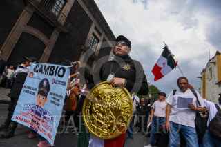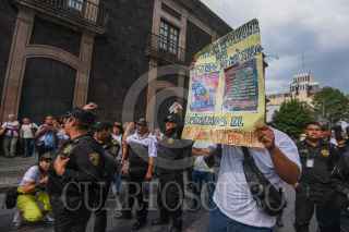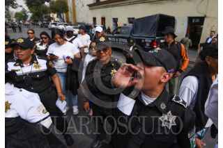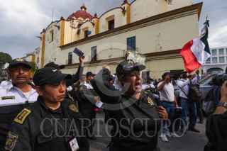TOLUCA, ESTADO DE MÉXICO, 14SEPTIEMBRE2023.- Policías auxiliares pertenecientes al CUSAEM se manifestaron previo a la toma de protesta de Delfina Gómez como Gobernadora del Estado de México, a un costado de la Cámara de Diputados, exigen mejoras salariales y prestaciones, así como pago de tiempo extra y días festivos. FOTO: CRISANTA ESPINOSA AGUILAR /CUARTOSCURO.COM