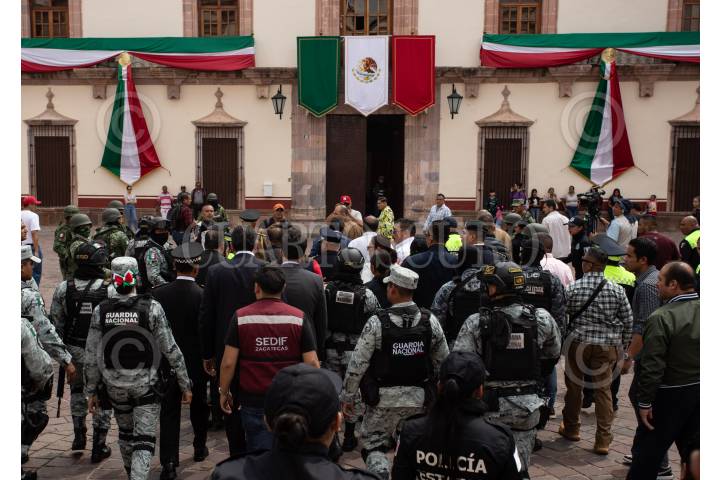 ZACATECAS, ZACATECAS, 16SEPTIEMBRE2023.- Colectivos de familiares de desaparecidos realizaron una manifestación pacífica en silencio, integrándose al final del “Desfile Militar” conmemorativo por el 16 de septiembre. El contingente de aproximadamente 50 madres y familiares caminaban detrás de los Charros, último grupo en el desfile, cuando fueron bloqueadas por policías de tránsito, lo que provocó que ellas decidieran mantenerse frente al templete del gobernador. El mandatario estatal sólo observó, después se retiró sin ninguna palabra, mientras algunas madres le gritaron exigiendo la búsqueda de sus familiares. FOTO: ADOLFO VLADIMIR /CUARTOSCURO.COM