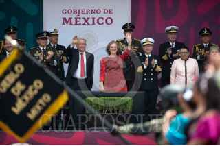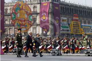 CIUDAD DE MÉXICO, 16SEPTIEMBRE2023.- Andrés Manuel López Obrador, presidente de México junto a Luis Cresencio Sandoval, secretario de la Defensa Nacional y Rafael Ojeda Durán, secretario de Marina en el Desfile Cívico Militar, 213 Años del Grito de Independencia. FOTO: PRESIDENCIA/CUARTOSCURO.COM