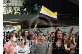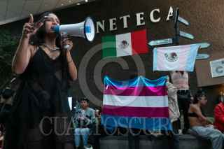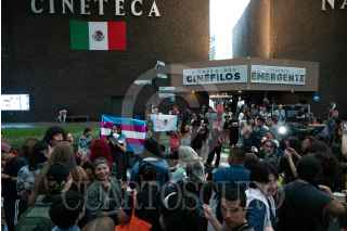 CIUDAD DE MÉXICO, 16SEPTIEMBRE2023.- La activista trans Laura Glover acompañada de hombres y mujeres de la comunidad trans se manifestaron en la Cineteca Nacional con una tianguis y la entrega de un pliego petitorio en que piden una sala de exposiciones para disidencias sexuales y un pase gratuito para personas no binarias y trans. Los hechos se dieron debido a que el pasado martes, elementos de seguridad del recinto retiraron con uso de fuerza a la activista cuando ella se encontraba en un baño de “mujeres”. FOTO: GALO CAÑAS/CUARTOSCURO.COM