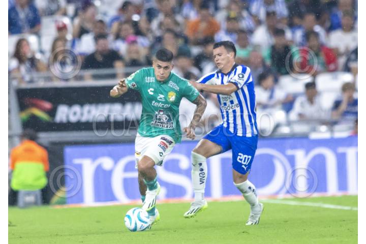 GUADALUPE, NUEVO LEÓN, 16SEPTIEMBRE2023.- Ali Ávila de los Rayados del Monterrey, se disputa el balón con Elías Hernández de León, en el estadio BBVA, partido correspondiente a la jornada 8 de la Apertura 2023. FOTO: GABRIELA PÉREZ MONTIEL / CUARTOSCURO.COM