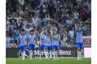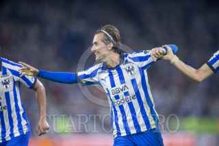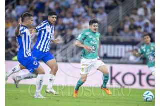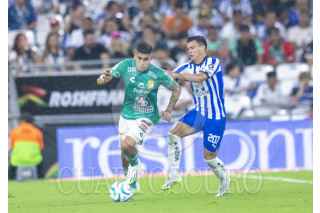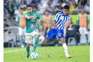 GUADALUPE, NUEVO LEÓN, 16SEPTIEMBRE2023.- Jesús Gallardo de los Rayados del Monterrey, se disputa el balón con José Ramírez de León, en el estadio BBVA, partido correspondiente a la jornada 8 de la Apertura 2023. FOTO: GABRIELA PÉREZ MONTIEL / CUARTOSCURO.COM