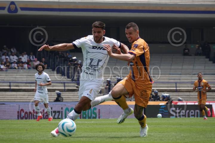 CIUDAD DE MÉXICO, 17SEPTIEMBRE2023.- Lisandro Magallán, defensa central de los Pumas, y Leó Bonatini, delantero centro del equipo del Atlético de San Luis, disputaron el balón durante la Jornada 8 de la Apertura 2023 en el Estadio Olímpico Universitario. FOTO: GRACIELA LÓPEZ /CUARTOSCURO.COM