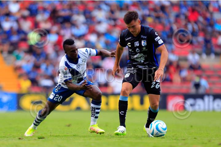 QUERÉTARO, QUERÉTARO, 17SEPTIEMBRE2023.- Kevin Velasco del Puebla y Ettson Ayón del Queretaro durante el partido de la jornada 8 del Torneo Apertura 2023 de la Liga MX, en el estadio Corregidora. El marcador fue de 1-1, con goles de Kevin Escamilla (Querétaro) y Diego de Buen (Puebla). FOTO: CÉSAR GÓMEZ/CUARTOSCURO.COM