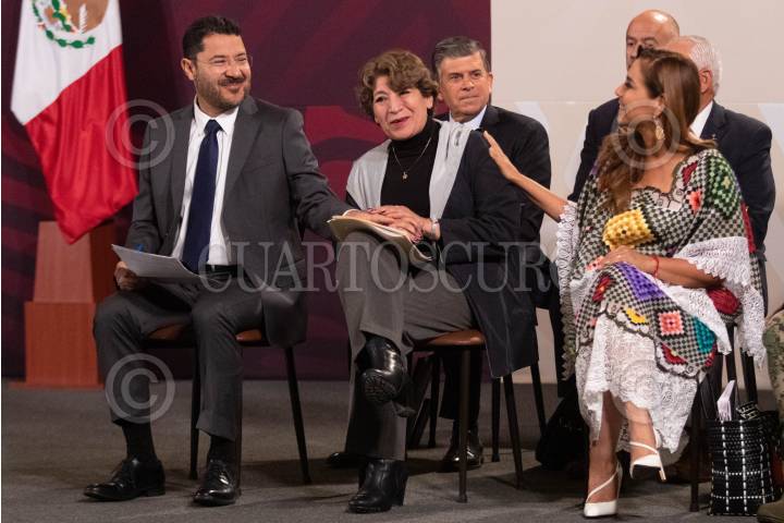 CIUDAD DE MÉXICO, 18SEPTIEMBRE2023.- Martí Batres, Jefe de Gobierno; Delfina Gómez, gobernadora del Estado de México, y Mara Lezama, gobernadora de Quintana Roo, durante la mañanera en la que se habló del Tren Interurbano y Tren Maya. FOTO: MOISÉS PABLO/CUARTOSCURO.COM