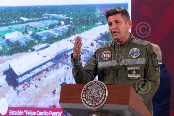 CIUDAD DE MÉXICO, 18SEPTIEMBRE2023.- Ricardo Vallejo Sánchez, comandante del agrupamiento de Ingenieros de la SEDENA, habló sobre los avances del Tren Maya y Tren Interoceánico, durante la mañanera. FOTO: MOISÉS PABLO/CUARTOSCURO.COM