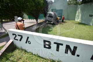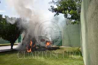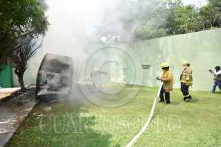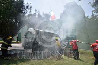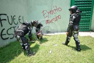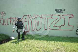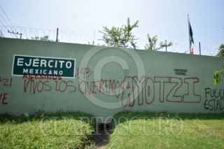 IGUALA, GUERRERO, 18SEPTIEMBRE2023.- Estudiantes de la Escuela Normal Rural 'Raúl Isidro Burgos' de Ayotzinapa, Padres de los 43 y Normalistas de todo país en el 27 Batallón de Infantería del municipio de Iguala de la Independencia. La jornada de este lunes a las 12:30 horas estudiantes arribaron a bordo de 20 autobuses hasta la zona militar de Iguala, dónde comenzaron un mitin en el exterior el cual fue interrumpido elementos de la Guardia Nacional que se encontraban al interior. Los cuales, desde el interior, lanzaron granadas de gas lacrimógeno con químicos y de humo al exterior del cuartel para disipar la manifestación, en repuesta los estudiantes lanzaron explosivos caseros y arrojaron un urvan de transporte de personal de la empresa Coppel a la cual le intentaron prender fuego. El vehículo no logró impactar contra la puerta principal, por lo que se quedó a unos metros mientras los estudiantes se retiraron del lugar. FOTO: DASSAEV TÉLLEZ ADAME/CUARTOSCURO.COM