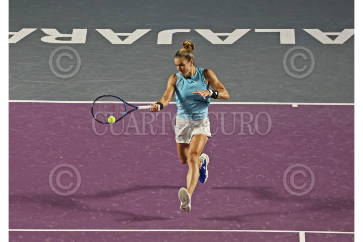 ZAPOPAN, JALISCO, 19SEPTIEMBRE2023.- Esta noche en las instalaciones del Centro Panamericano de Tenis, en donde se lleva a cabo el Torneo Guadalajara Open WTA 1000, se enfrentaron en partido eliminatorio las tenistas Storm Hunter (AUS) vs Maria Sakkari (USA), en donde al final la tenista Griega se llevo la victoria. En la imagen se observa a la tenista Maria Sakkari, durante el desarrollo del juego. FOTO: FERNANDO CARRANZA GARCIA / CUARTOSCURO.COM