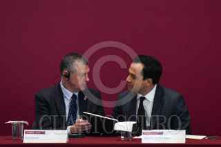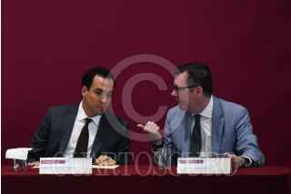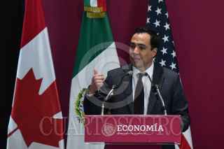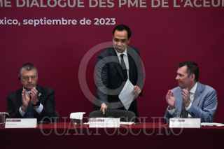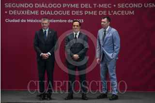 CIUDAD DE MÉXICO, 21SEPTIEMBRE2023.- Rob Stewart, viceministro de Comercio Internacional de Canadá; Alejandro Encinas Nájera, subsecretario de Comercio Exterior de México y Jayme White, representante comercial adjunto de Estados Unidos, encabezaron en el lobby de la Torre Ejecutiva de la Secretaría de Economía, el Segundo Diálogo PYME T-MEC. FOTO: MARIO JASSO/CUARTOSCURO.COM