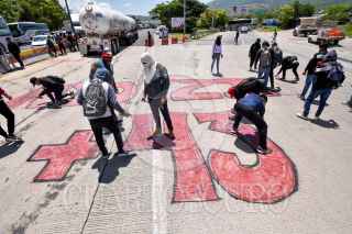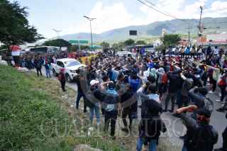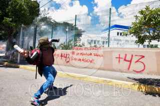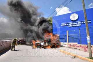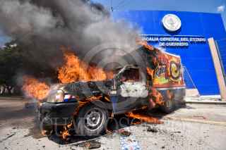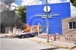 CHILPANCINGO, GUERRERO, Estudiantes de la Escuela Normal Rural ‘Raúl Isidro Burgos’ de Ayotzinapa, junto con normalistas que integran la Federación de Estudiantes Campesinos Socialistas de México (FECSM) utilizaron una camioneta distribuidora de la empresa Marinela para derribar la entrada principal de la Fiscalía General del Estado (FGE), a la que prendieron fuego y luego lanzaron petardos contra el inmueble. Lo anterior, como parte de la jornada de movilizaciones por el noveno aniversario de la desaparición de sus compañeros. Los estudiantes llegaron en autobuses, cerraron la Autopista del Sol para realizar un mitiny posteriormente liberaron un carril de cada lado para realizar un volanteo, repartiendo panfletos a los automovilistas que pasaban por el lugar. Dentro de los panfletos se exigía que el Ejército Mexicano entregue la información sobre: “La comunicación que habla que 17 estudiantes fueron trasladados a la Brecha de los Lobos, así como de las últimas comunicaciones de Julio César López Patolzin, agente militar encubierto en Ayotzinapa, hoy desaparecido, los últimos reportes de los agentes de inteligencia militar que dieron seguimiento a los estudiantes en Iguala, los últimos reportes del C4 que corresponden al momento de la desaparición de los estudiantes y la información negada es relevante para dar con el paradero de los estudiantes desaparecidos. FOTO: DASSAEV TÉLLEZ ADAME/CUARTOSCURO.COM