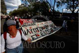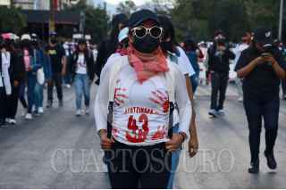 OAXACA, OAXACA, 26SEPTIEMBRE2023.- Está tarde integrantes de la Coordinadora Estudiantil Normalista del Estado de Oaxaca (Ceneo) marcharon al zócalo de la capital de Oaxaca para conmemorar el 9º aniversario de la desaparición de los 43 estudiantes de la Escuela Normal Raúl Isidro Burgos de Ayotzinapa, Guerrero. En el trayecto realizaron algunas pintas. FOTO: CAROLINA JIMÉNEZ/CUARTOSCURO.COM