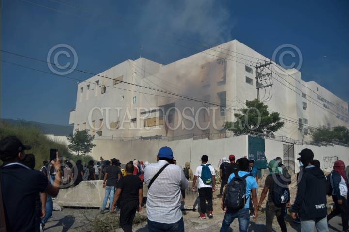 IGUALA, GUERRERO, 27SEPTIEMBRE2023.- Normalistas rurales de Ayotzinapa y de la Federación de Estudiantes Campesinos Socialistas de México (FECSM) utilizaron un tráiler para abrir las reforzadas puertas del Palacio de Justicia de Iguala, al que lanzaron piedras y prendieron fuego, en represalia por ocultar información relacionada con los ataques del 26 de septiembre de 2014. La actividad se desarrolló después de que terminara el mitin realizado por los 9 años de los ataques perpetrados por sicarios de Guerreros Unidos (GU), así como elementos de diferentes corporaciones policíacas. El contingente de normalistas llegó a bordo de 24 autobuses, que salieron pasado el mediodía de la cabecera municipal de Tixtla, en la región Centro hasta llegar a la cina de la bandera nacional. Los normalistas colocaron ofrendas florales en las estelas de luz, donde fueron asesinados a balazos sus compañeros Julio César Ramírez Nava y Daniel Solís Gallardo. FOTO: DASSAEV TÉLLEZ ADAME/CUARTOSCURO.COM