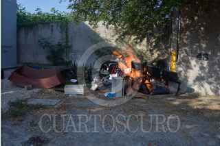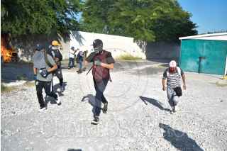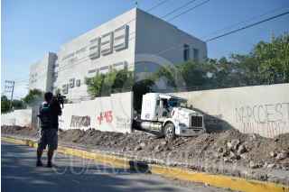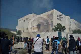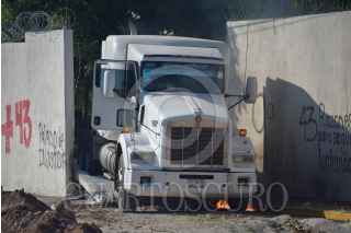 IGUALA, GUERRERO, 27SEPTIEMBRE2023.- Normalistas rurales de Ayotzinapa y de la Federación de Estudiantes Campesinos Socialistas de México (FECSM) utilizaron un tráiler para abrir las reforzadas puertas del Palacio de Justicia de Iguala, al que lanzaron piedras y prendieron fuego, en represalia por ocultar información relacionada con los ataques del 26 de septiembre de 2014. La actividad se desarrolló después de que terminara el mitin realizado por los 9 años de los ataques perpetrados por sicarios de Guerreros Unidos (GU), así como elementos de diferentes corporaciones policíacas. El contingente de normalistas llegó a bordo de 24 autobuses, que salieron pasado el mediodía de la cabecera municipal de Tixtla, en la región Centro hasta llegar a la cina de la bandera nacional. Los normalistas colocaron ofrendas florales en las estelas de luz, donde fueron asesinados a balazos sus compañeros Julio César Ramírez Nava y Daniel Solís Gallardo. FOTO: DASSAEV TÉLLEZ ADAME/CUARTOSCURO.COM
